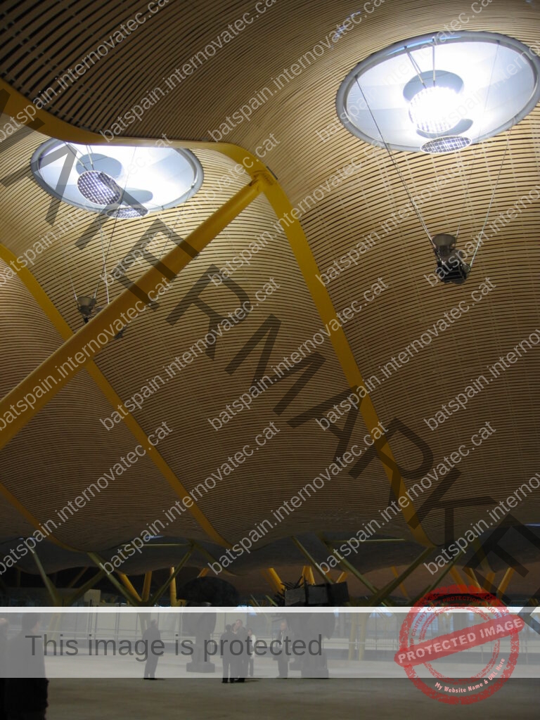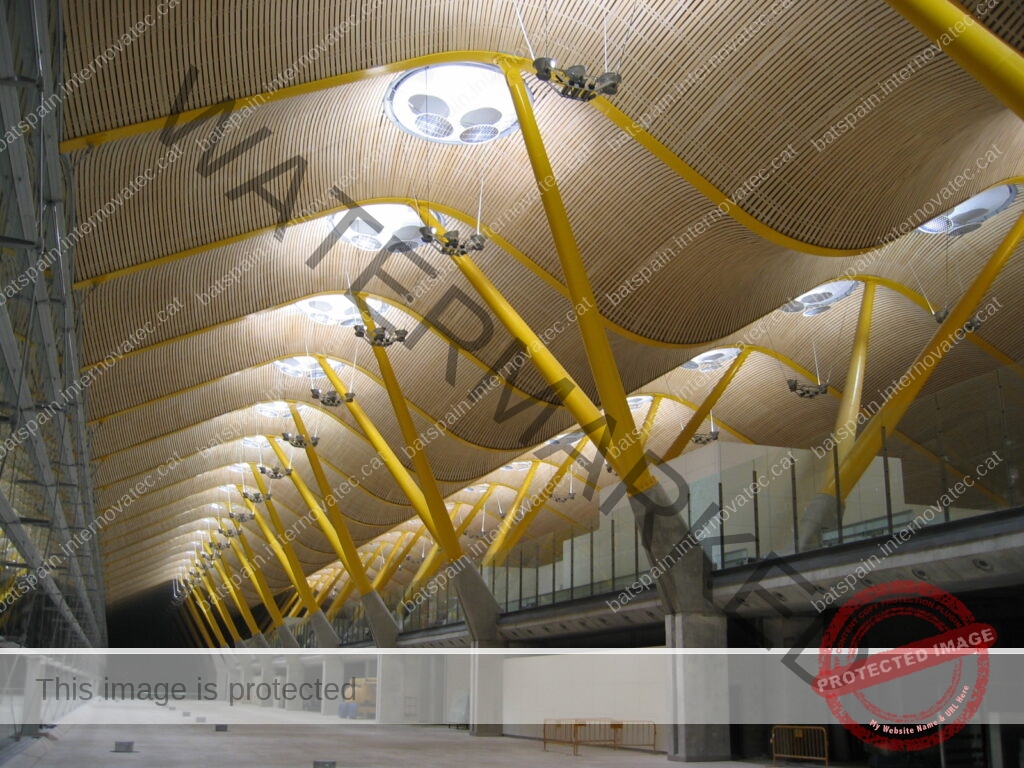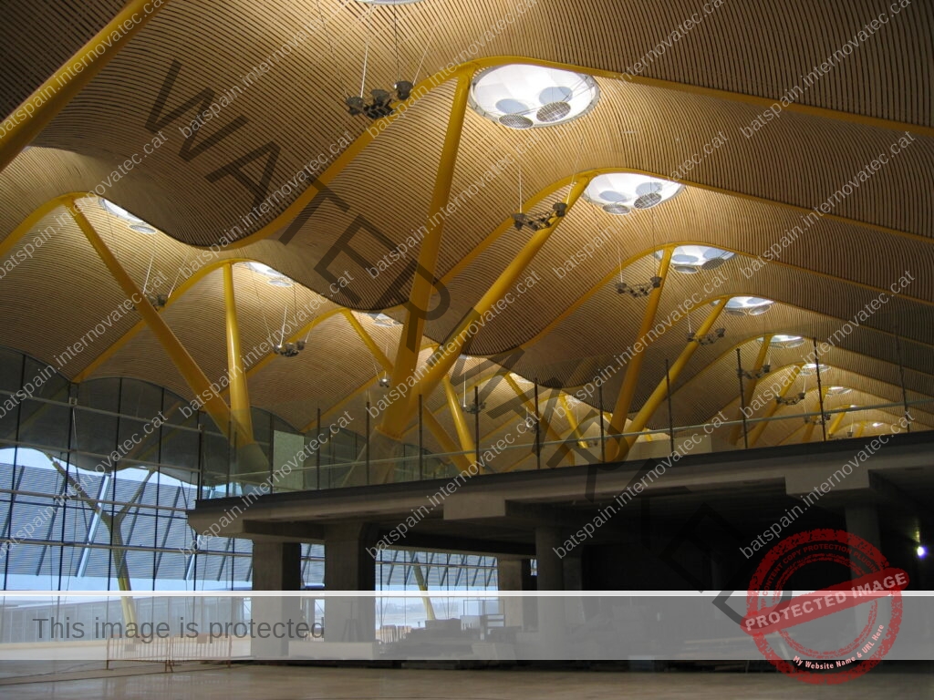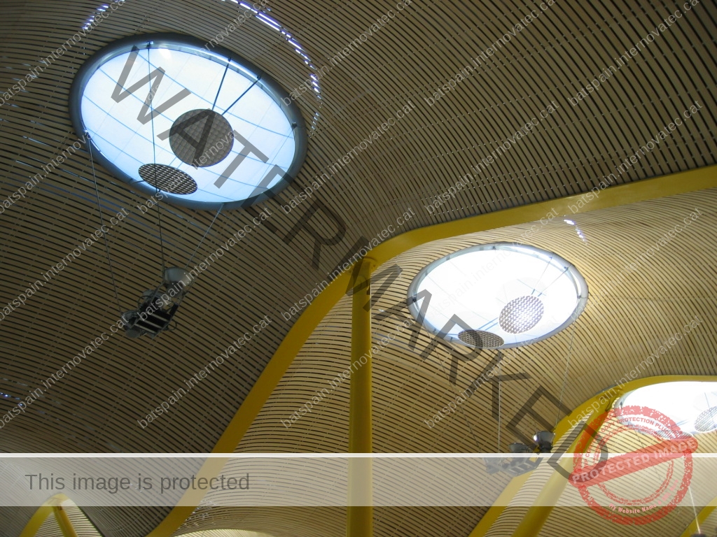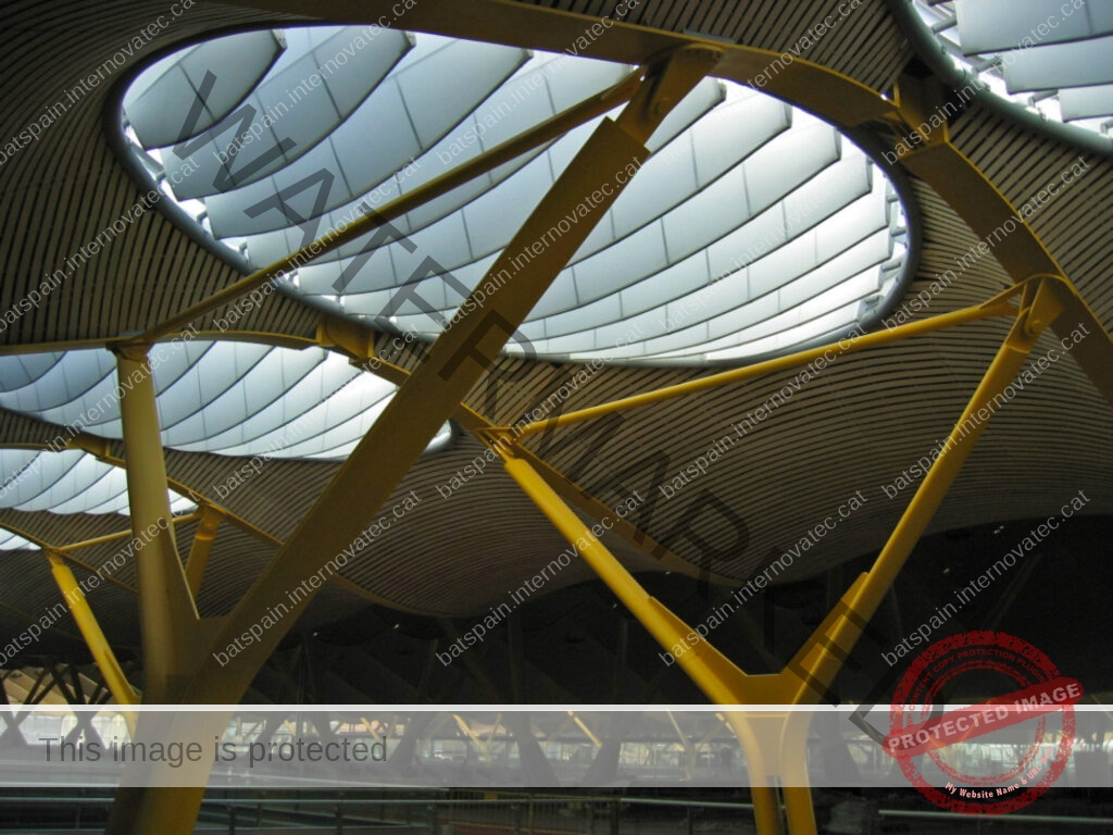 Difusores textiles circulares y ovales de ETFE transparente y silicone-glass bajo los lucernarios de la terminal 4 y edificio satélite, para evitar deslumbramientos por luz directa. BAT SPAIN participó en la ingeniería de los difusores, así como en la supervisión de la instalación.