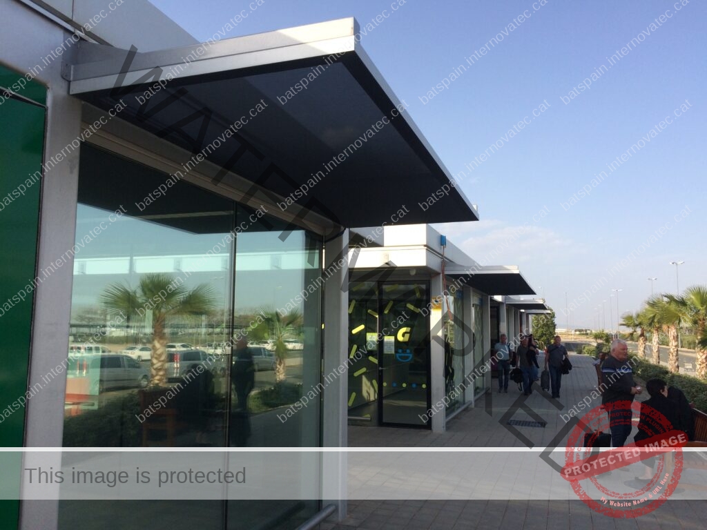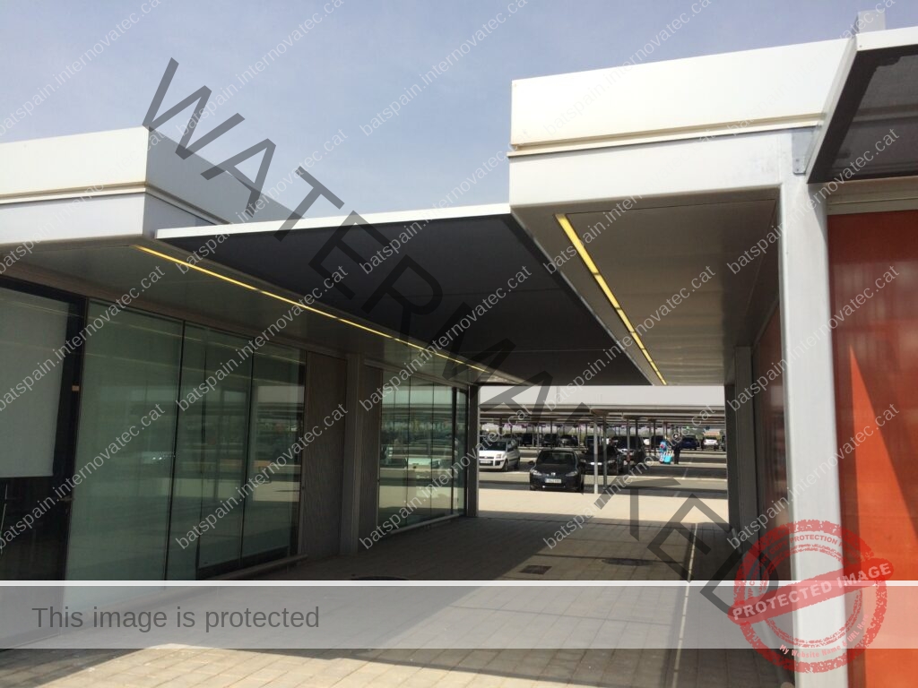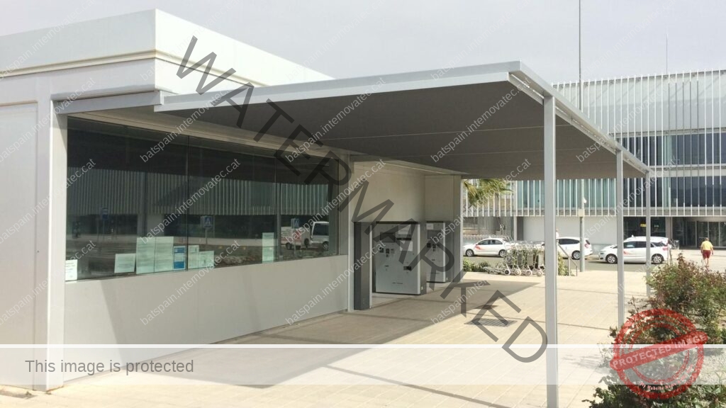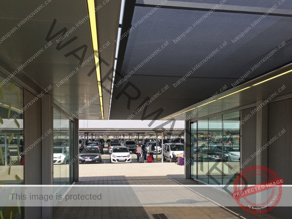 Marquesinas textiles realizadas con bastidores BATenso para protección solar del área de alquiler de coches del nuevo Aeropuerto de Corvera.
