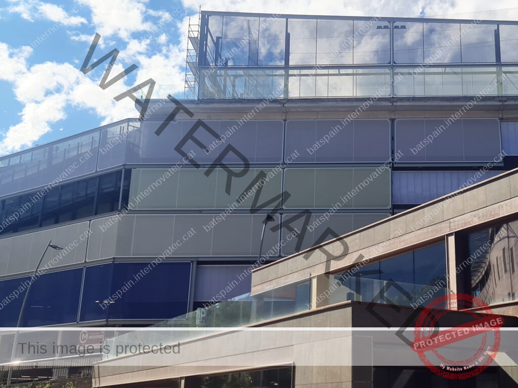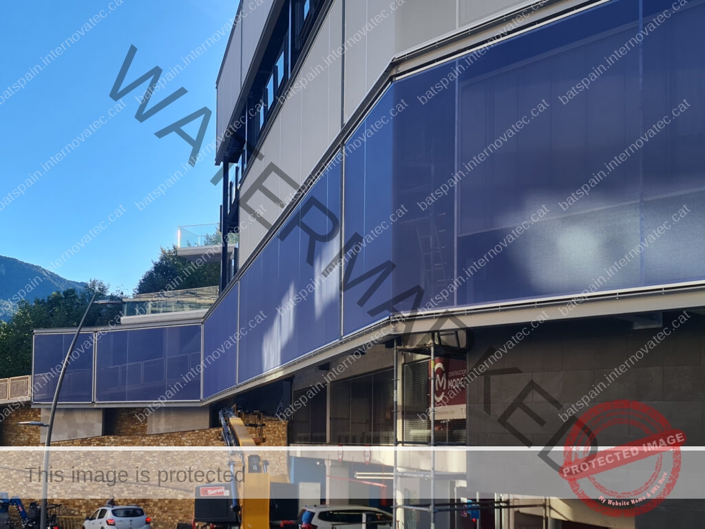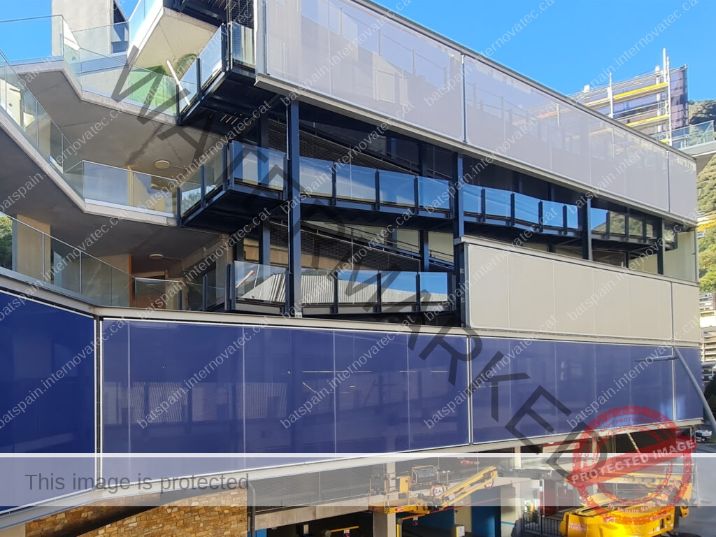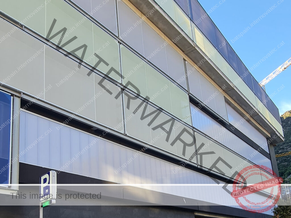 Fachada textil para aparcamiento en altura en Escaldes-Engordany (Andorra). El edificio, situado junto al Hospital Nostra Senyora de Meritxell, presenta bandas horizontales de diferentes colores con tejido microperforado, para revestir la estructura de un aparcamiento en altura, permitiendo la ventilación de humos en las plantas de aparcamiento.
