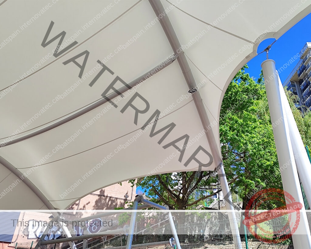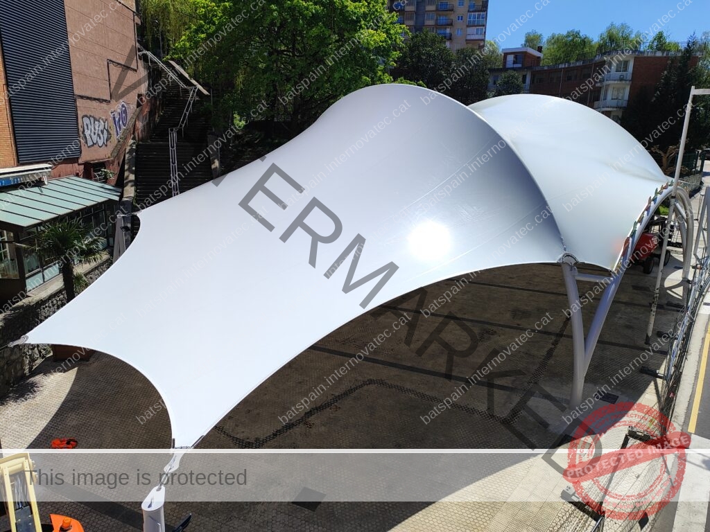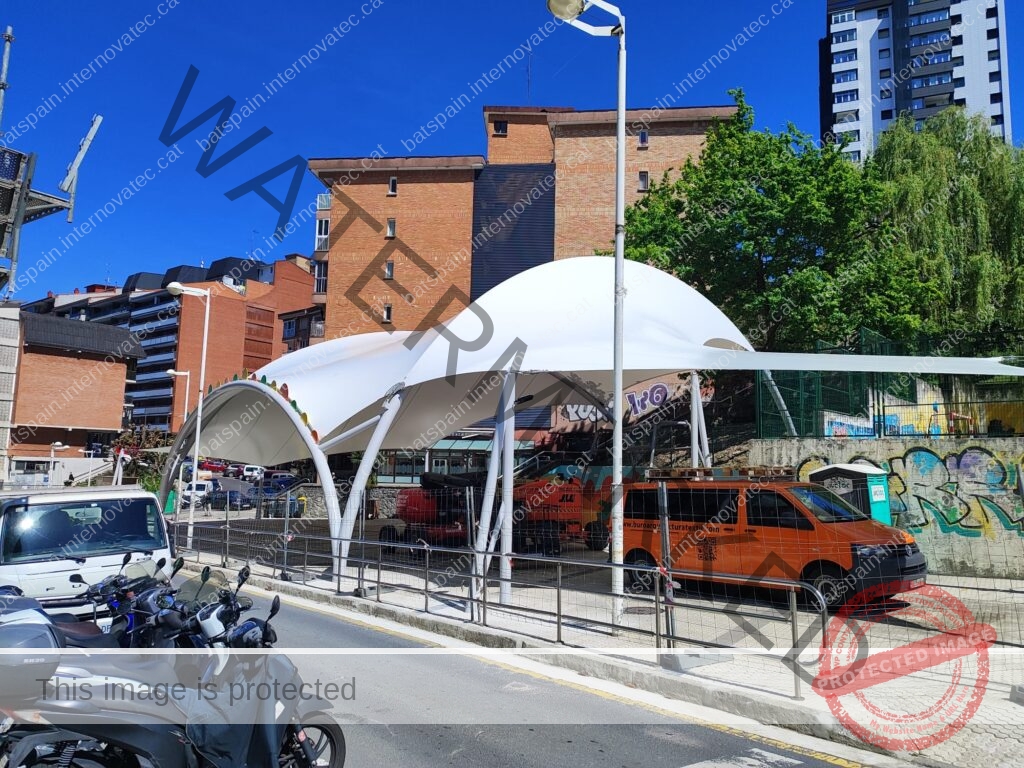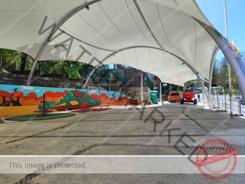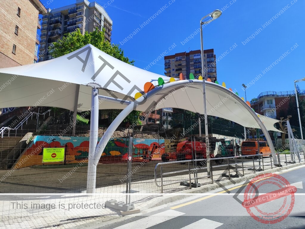 La cubierta textil más grande construída hasta la fecha en Donostia, para cubrir la zona de juegos infantiles del parque de Bertsolari Txirrita. Combinación de batbanner, bordes libres con cables junto con estructura de arcos y bípodes. Adaptada al proyecto urbano y de juegos infantiles de la plaza.