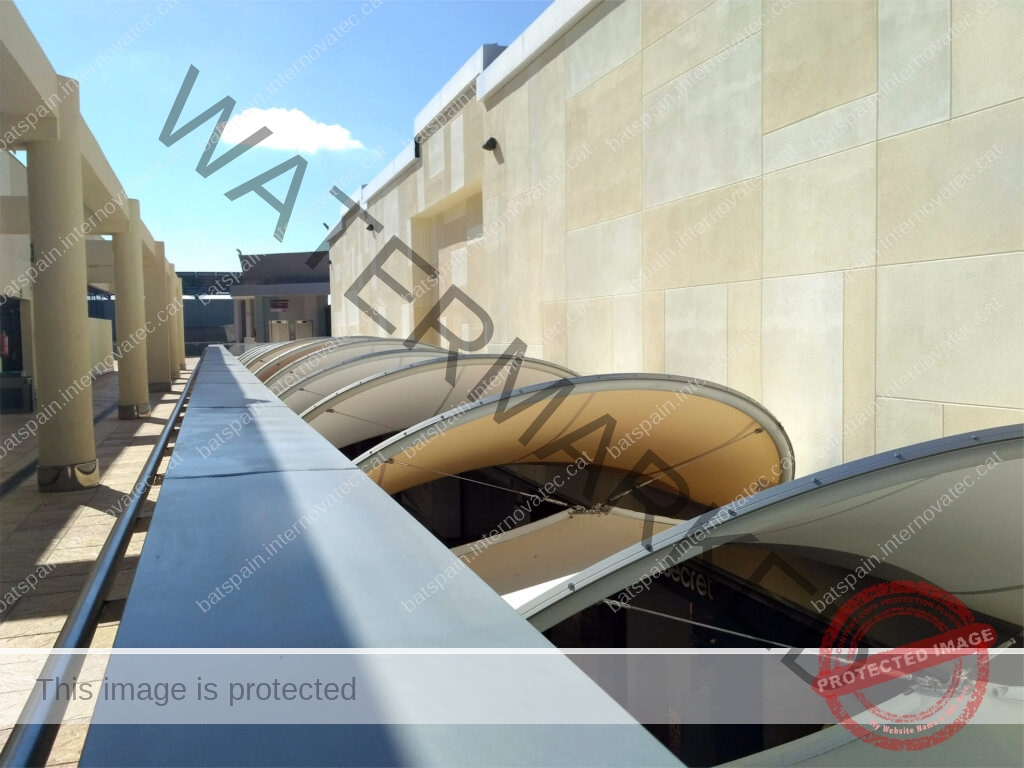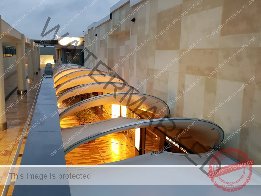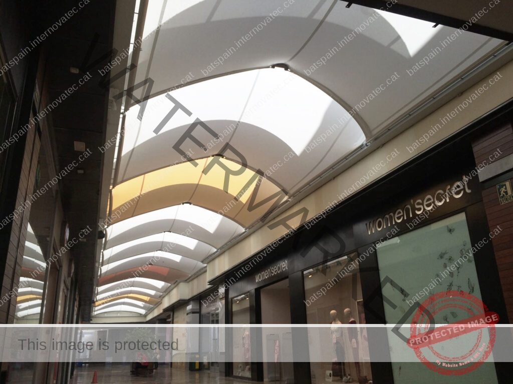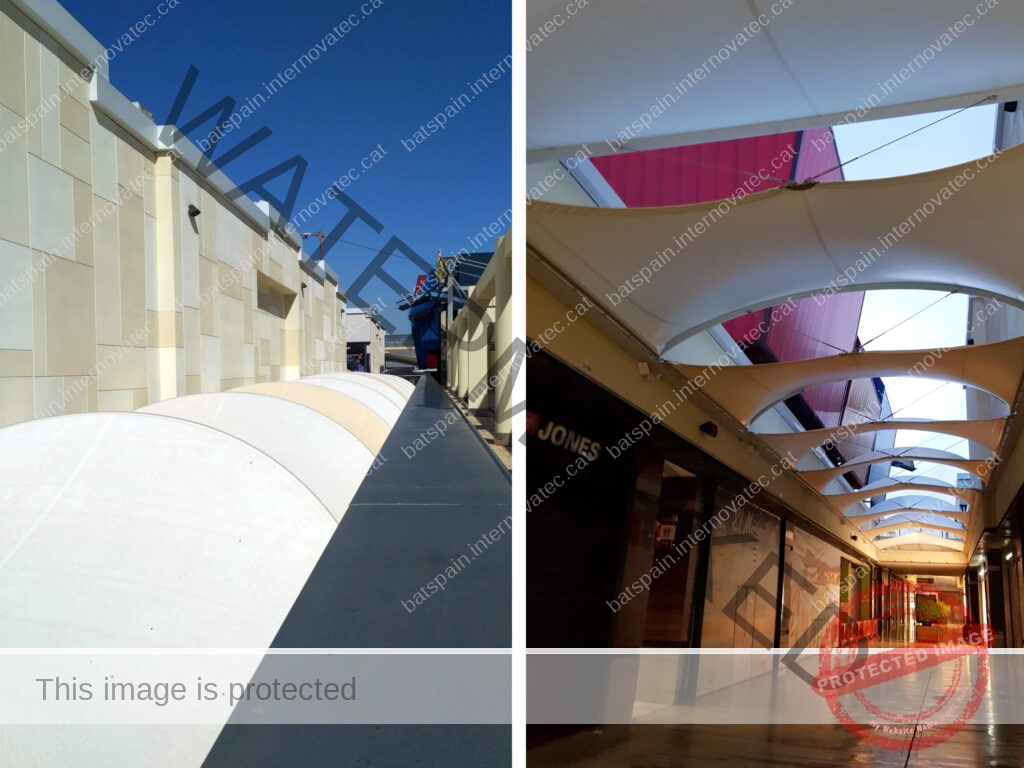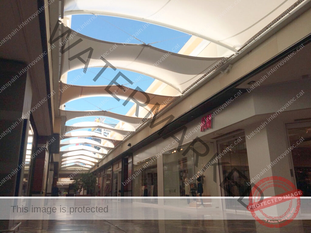 Bat Spain fabricó e instaló estas cubiertas textiles para la protección solar y frente a la lluvia de los pasillos comerciales situados a ambos laterales de los cines.