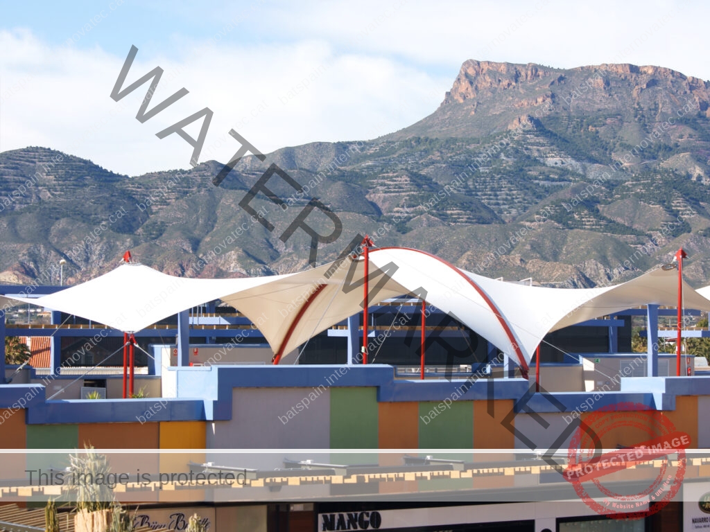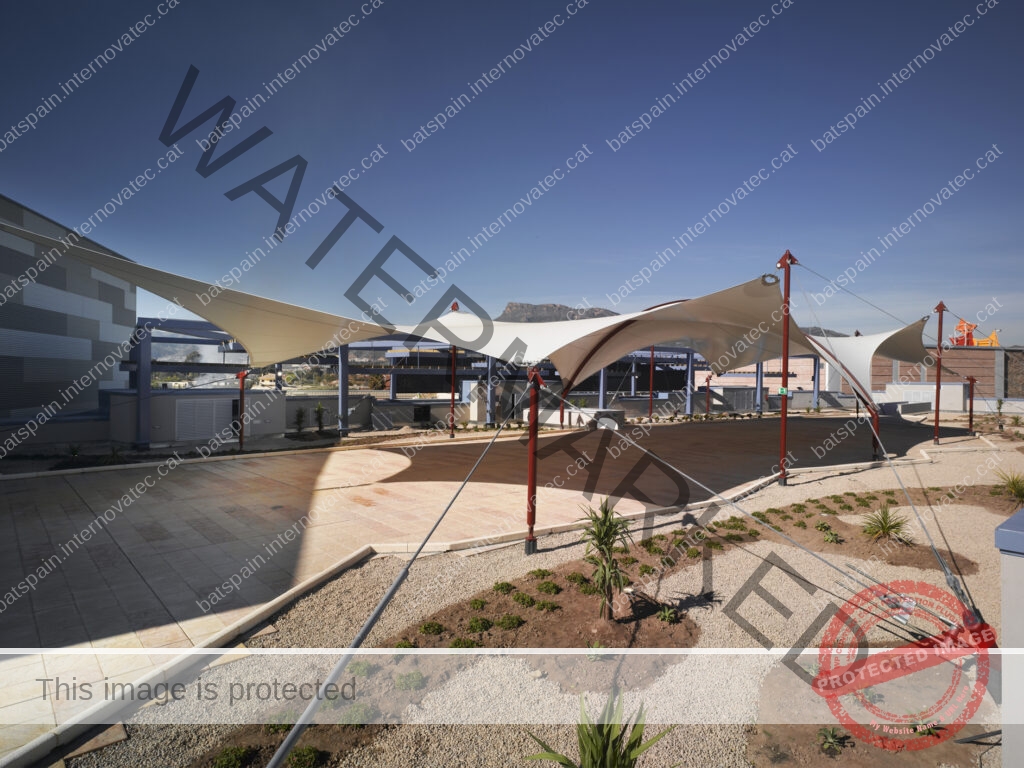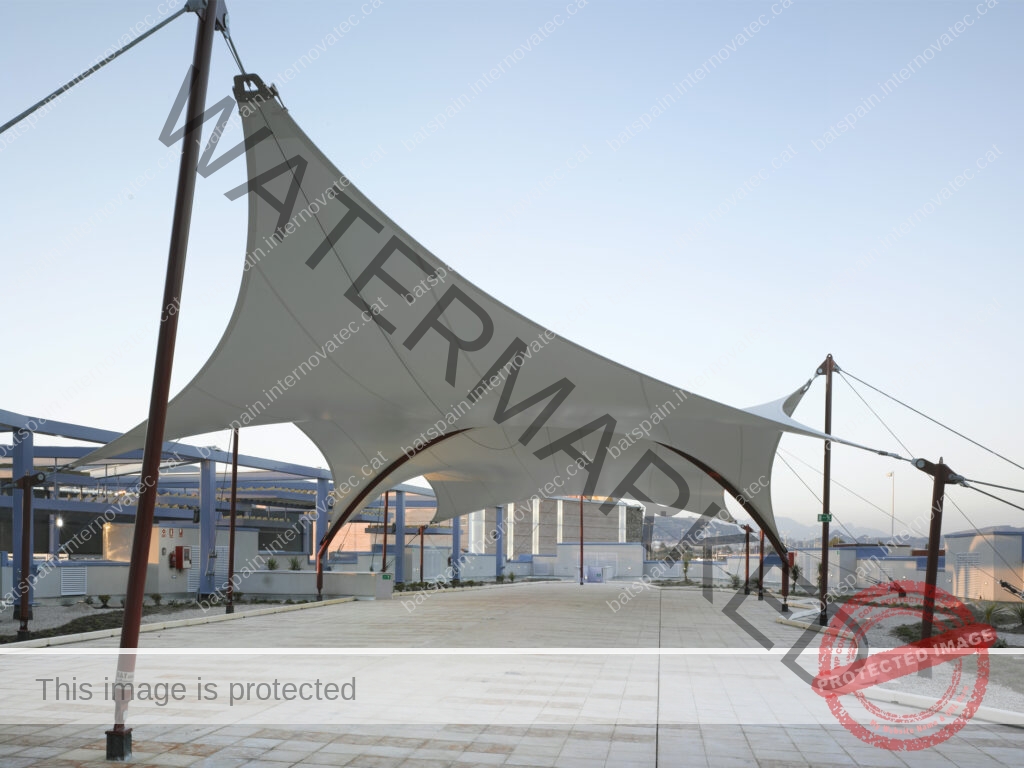 Cubierta textil compuesta por mástiles atirantados mediante cables de acero, un arco central y membrana blanca translúcida, con una dimensión de 54x18m.