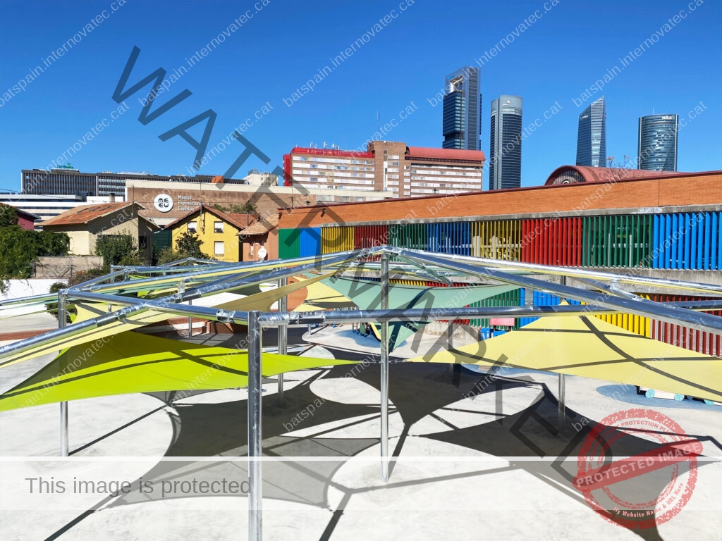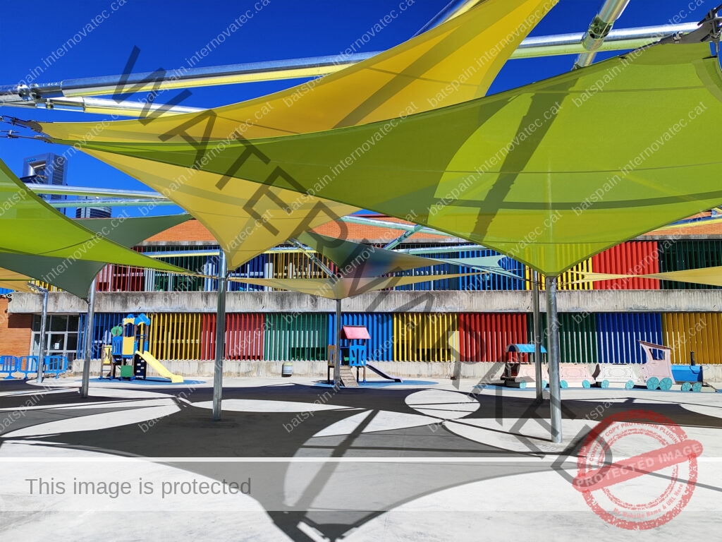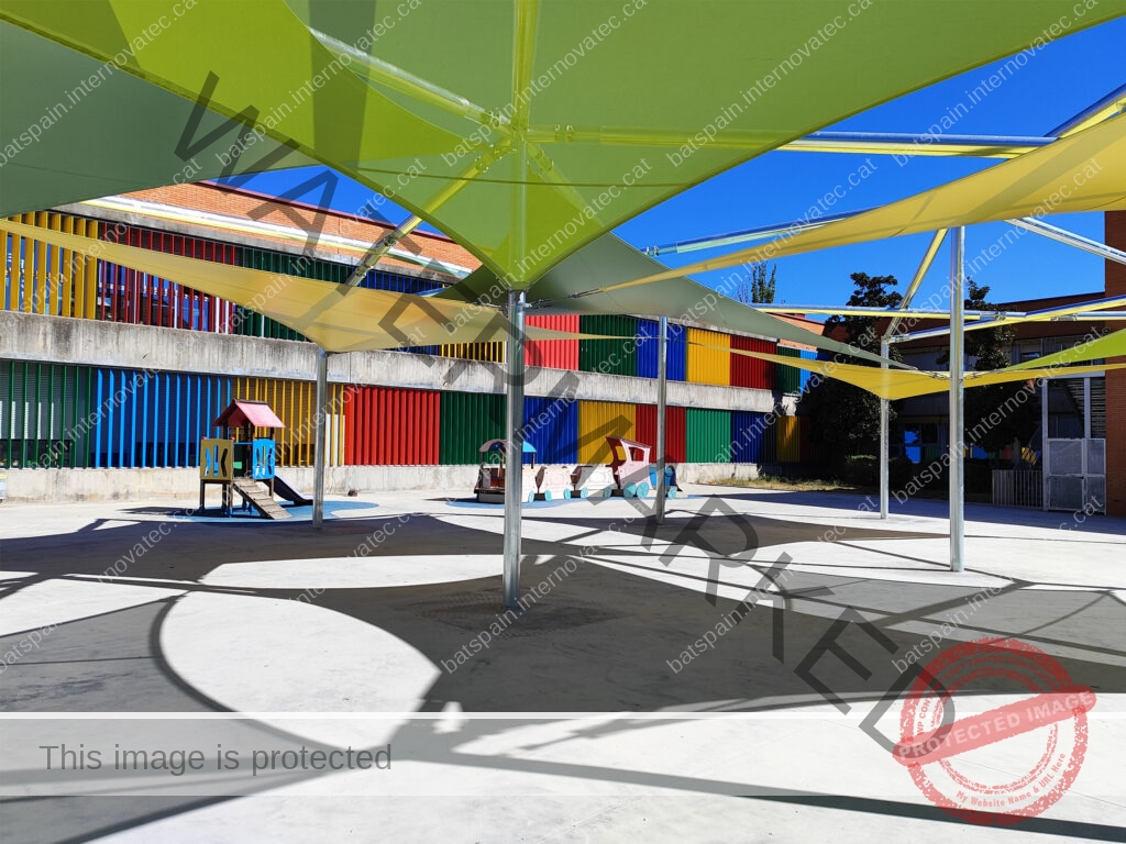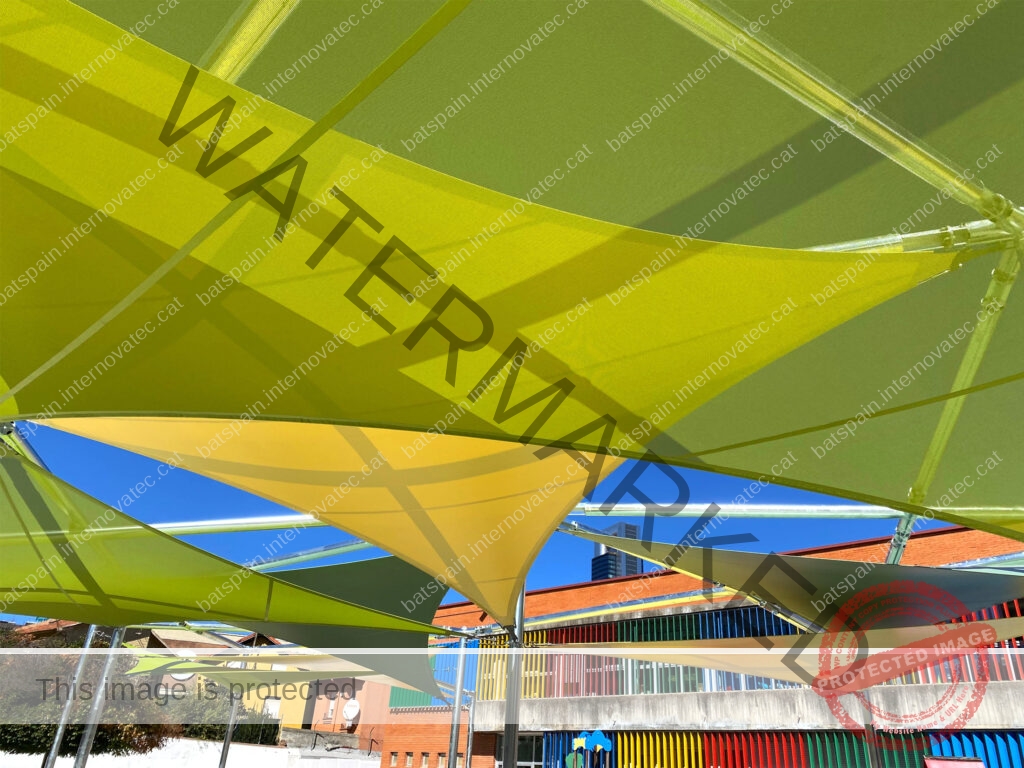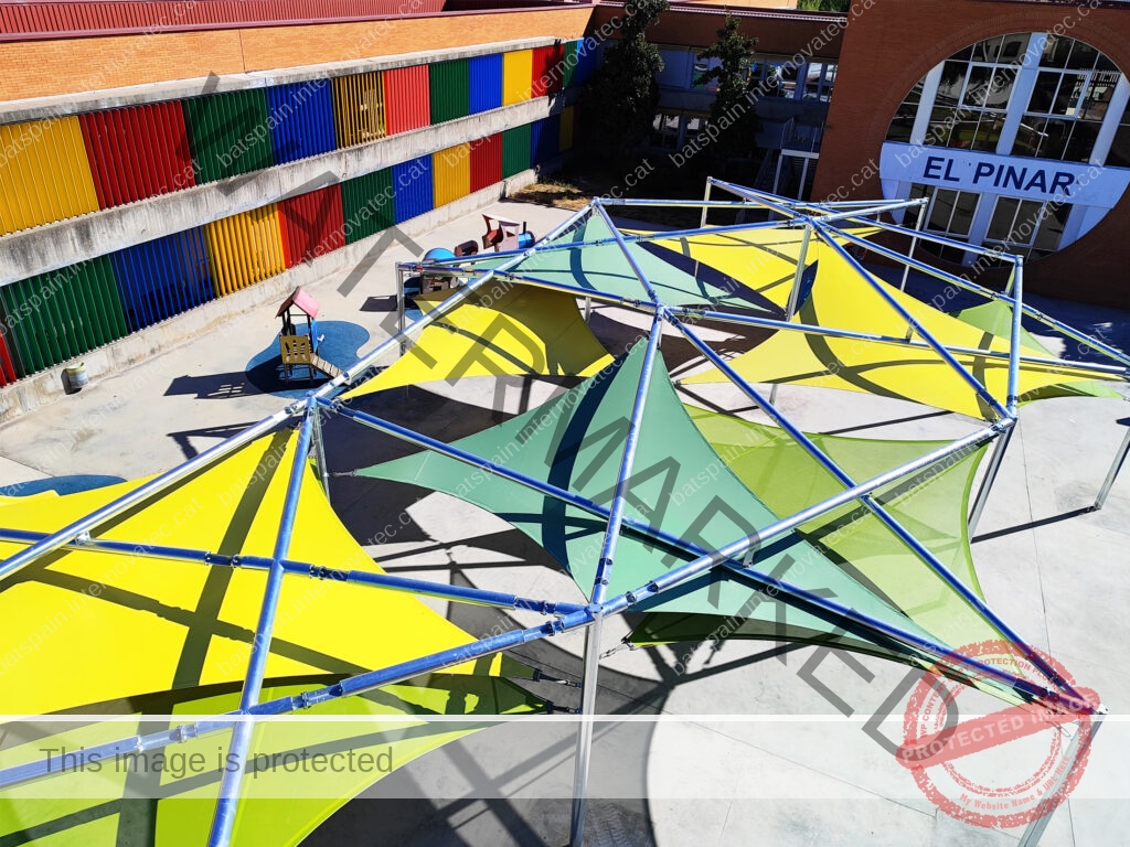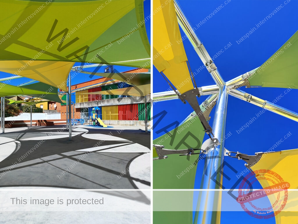 La estructura, realizada en acero galvanizado en caliente, evoca la geometría orgánica de los troncos de los árboles, aportando una estética natural y armoniosa al entorno escolar. Sobre ella se despliegan varias velas textiles tensadas, confeccionadas en tejidos impermeables y microperforados, y en una cuidada selección de colores. Estas velas simulan las copas y hojas de los árboles, generando zonas de sombra que protegen del sol sin restar luminosidad ni ventilación.