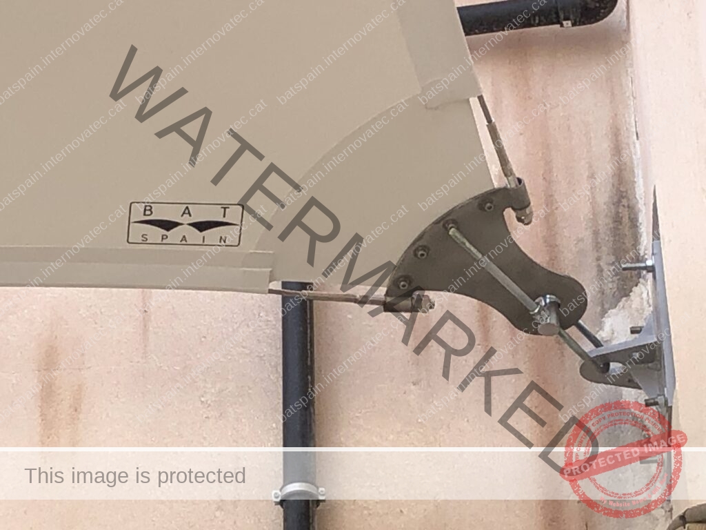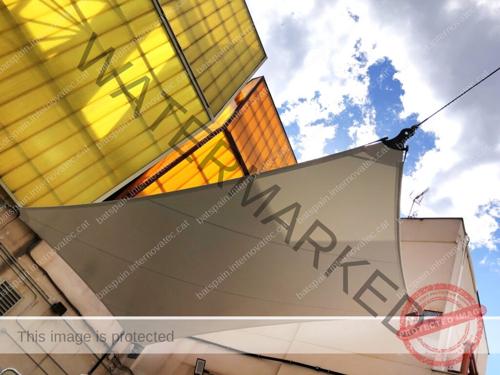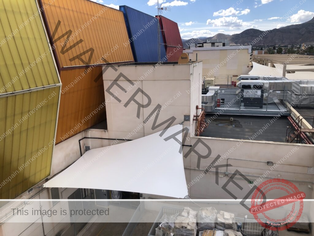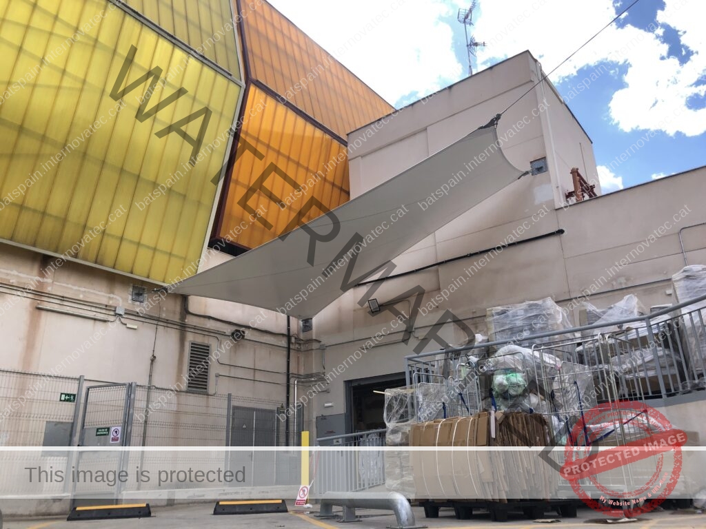 Cubierta textil impermeable sobre el muelle de carga de Primark en el C.C. Parque Almenara de Lorca, con forma de paraboloide anclado a cuatro puntos a distintas alturas para proteger del sol y la lluvia la zona de carga y descarga.