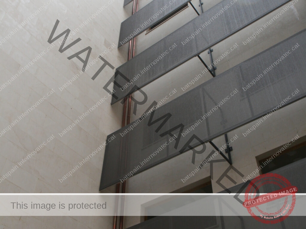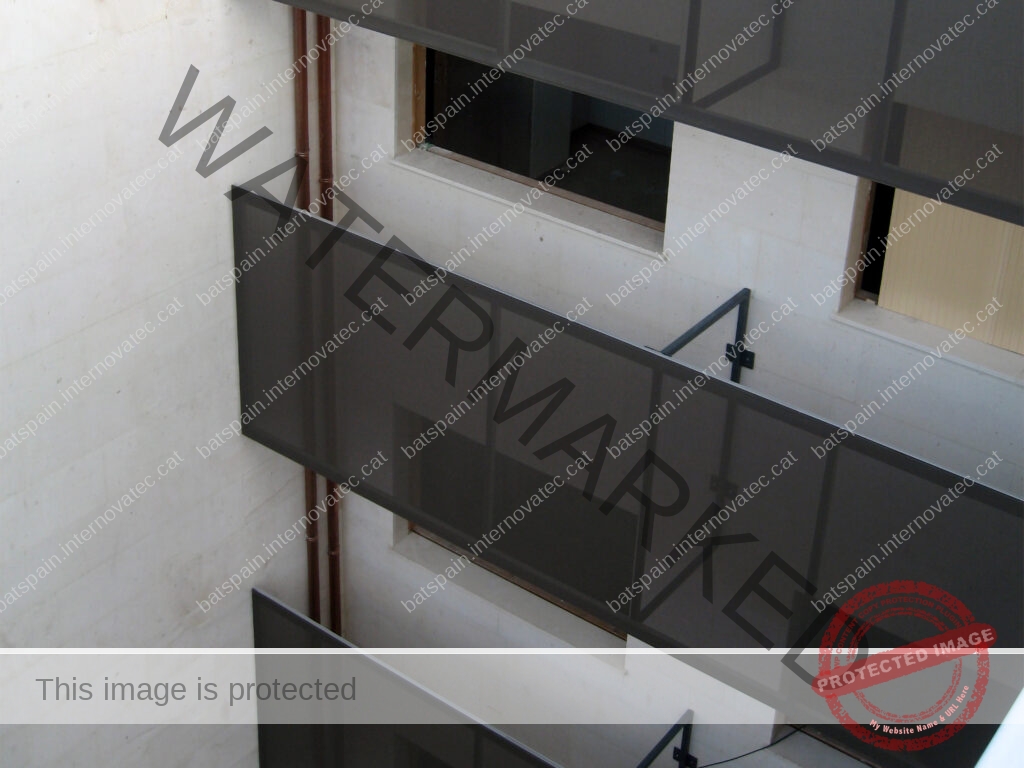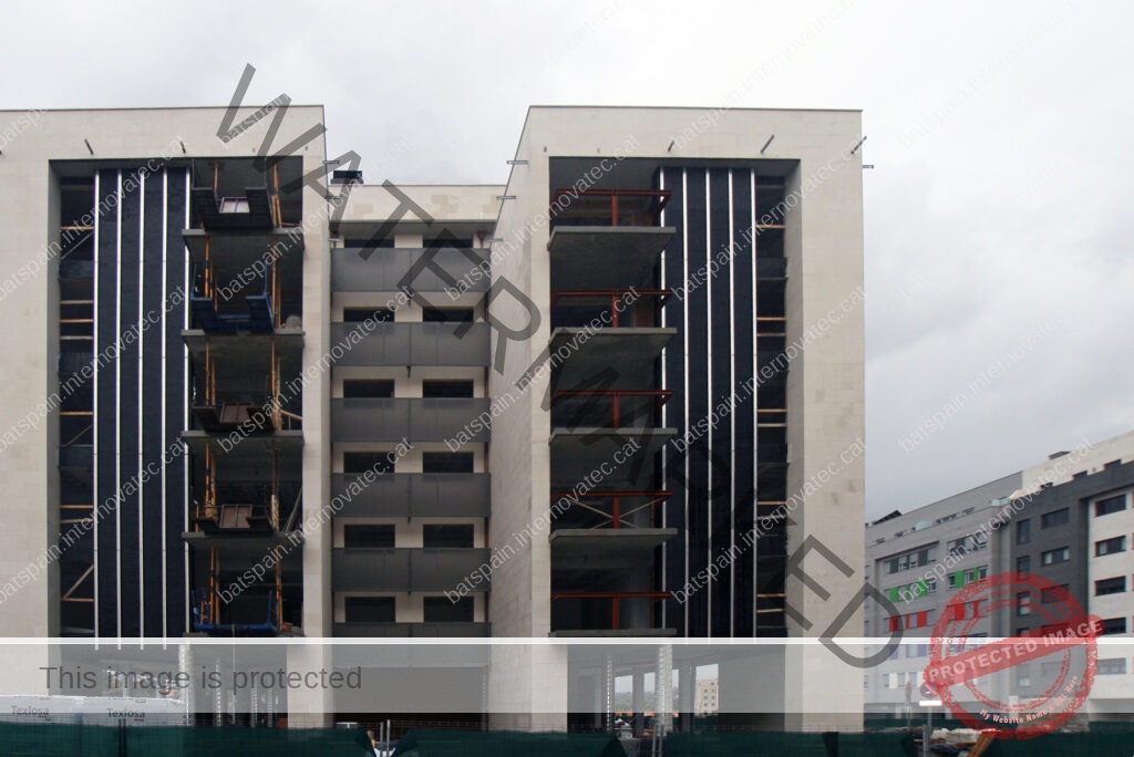Fachada textil realizada con bastidores autoportantes BATenso, para patios laterales de edificio de viviendas de nueva construcción.