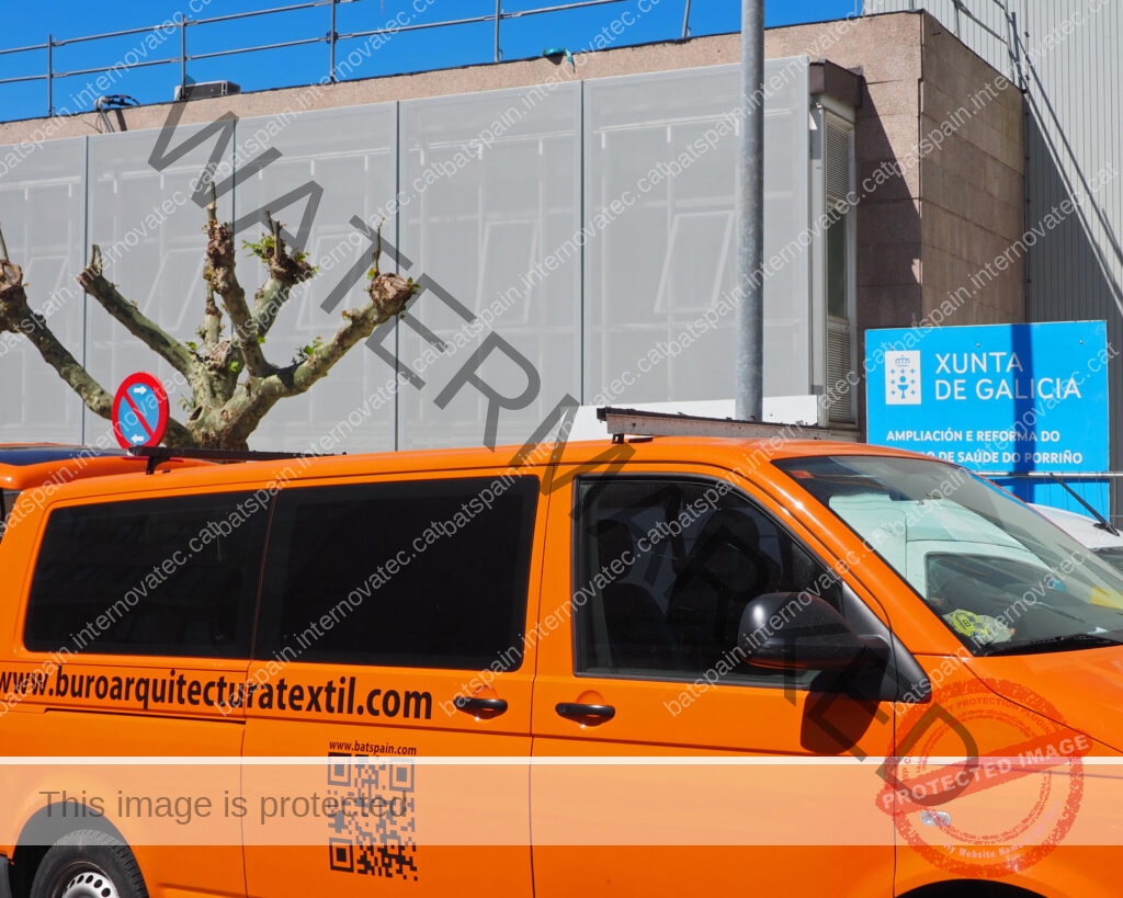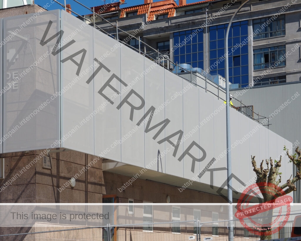 Para la rehabilitación y ampliación del Centro de Salud de O Porriño en Vigo contaron con la construcción de una fachada textil de BATSPAIN como una nueva segunda piel funcional y estética que oculta la fachada antigua. El sistema empleado fue BATENSO, idóneo para edificios ya construídos ya que las tensiones de la tela las aguanta el marco del bastidor y por tanto no se transmiten a la estructura del edificio.