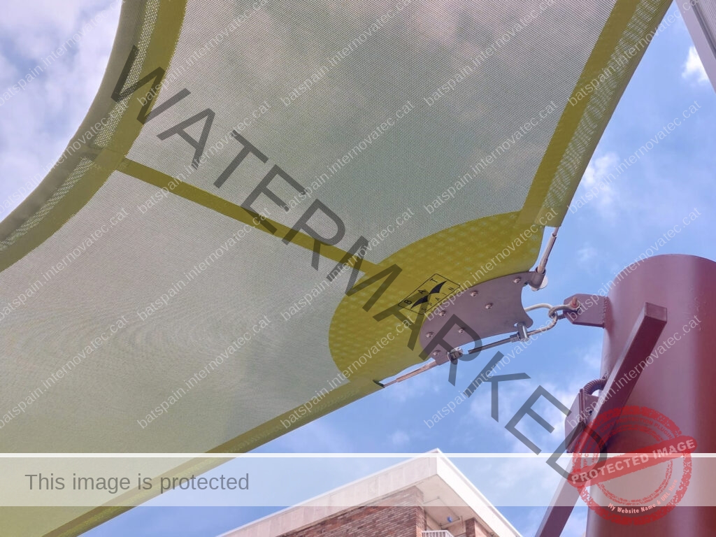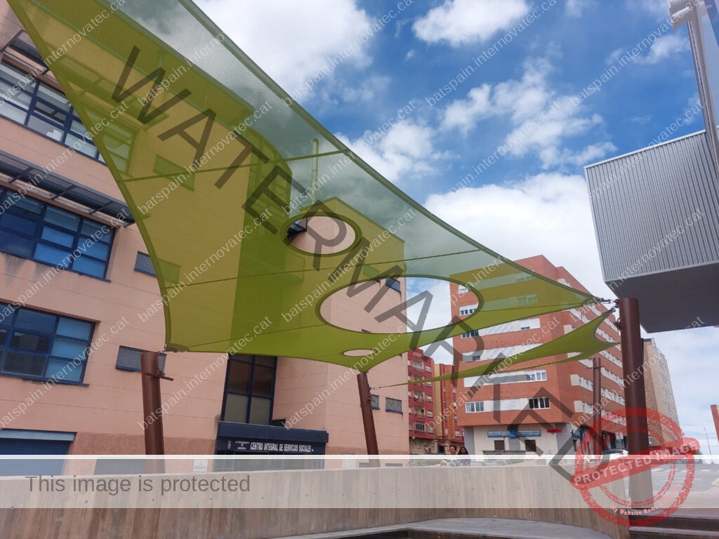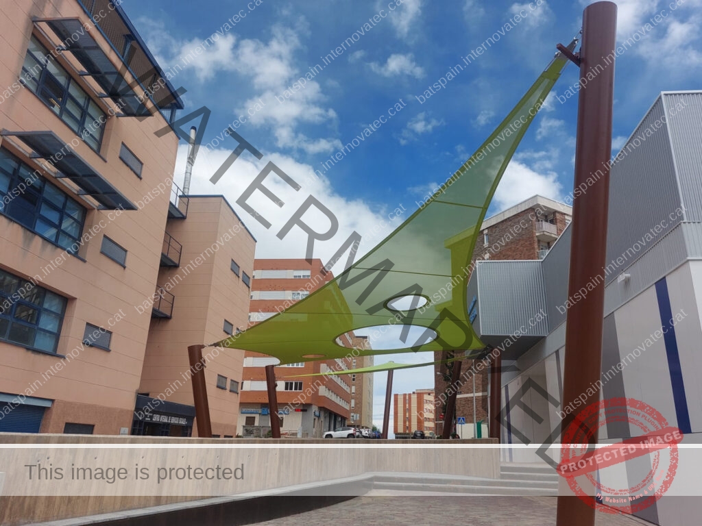 Esta velas de tejido microperforado no solo mejora la funcionalidad del espacio, proporcionando sombra y confort a los viandantes, sino que también añade un elemento de diseño distintivo y moderno al acceso del mercado. Su geometría orgánica, con un diseño que simula elementos vegetales en color verde primavera y mástiles marrones, se integra de forma natural en el entorno urbano creando una experiencia visual atractiva y novedosa.