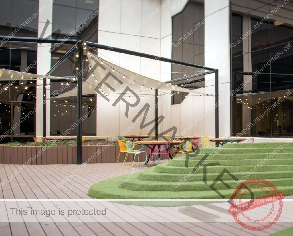 Cubierta textil compuesta por dos velas textiles tensadas para el patio de las nuevas oficinas de Schneider Electric en Madrid.