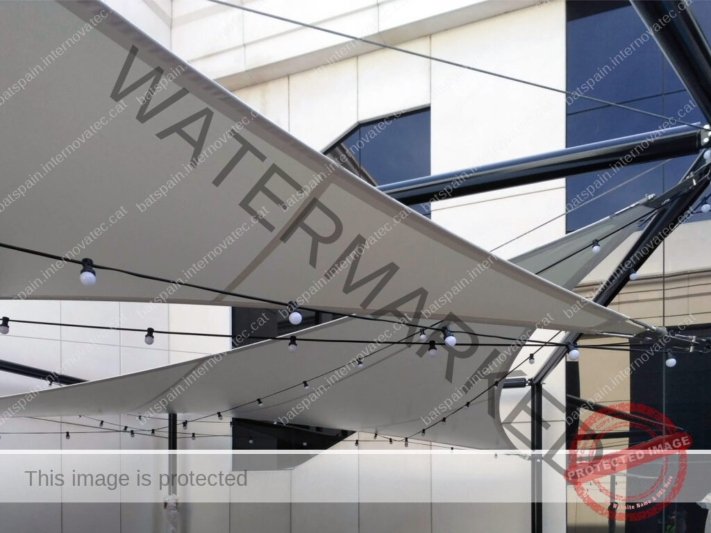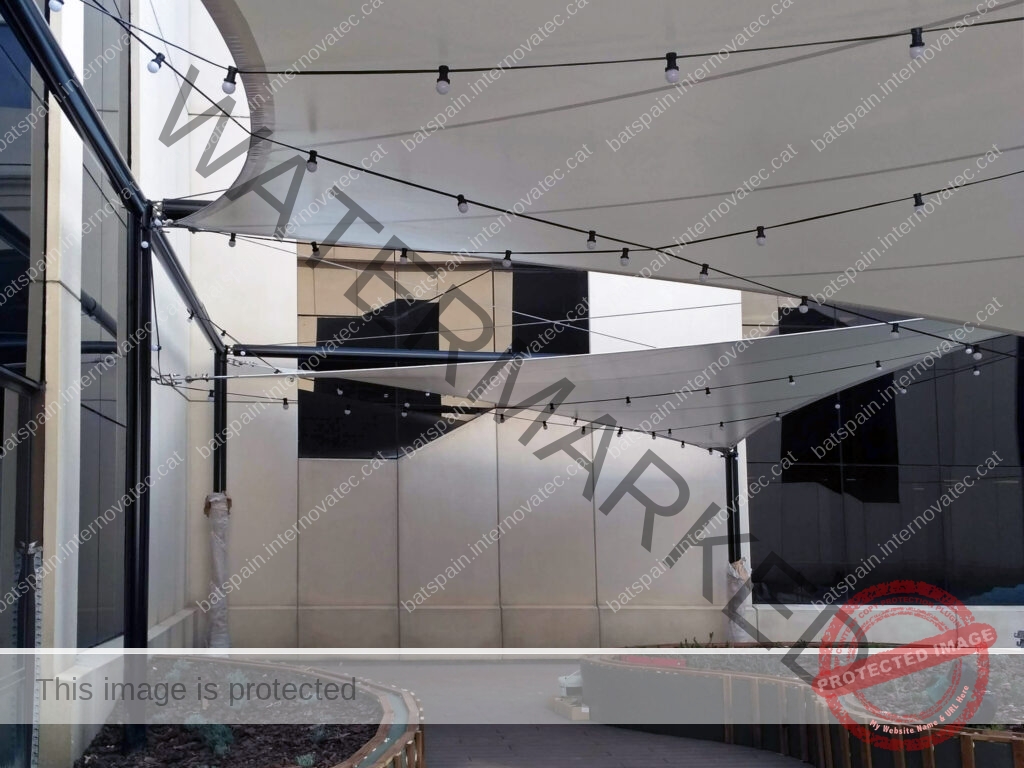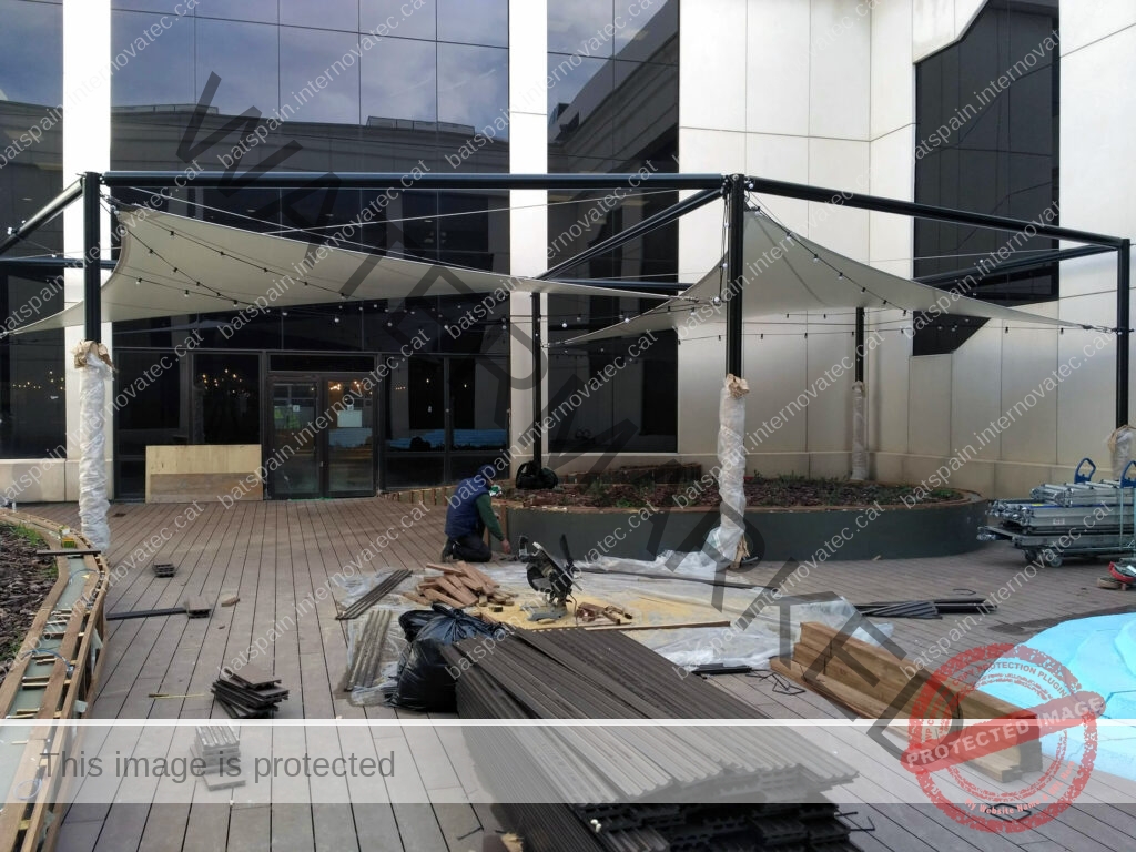 Se han realizado mediante una estructura autoportante sobre la que se tensan las dos velas, mediante tensores en sus vértices y cables de borde en el perímetro alojados en bolsillo realizado con la propia membrana.