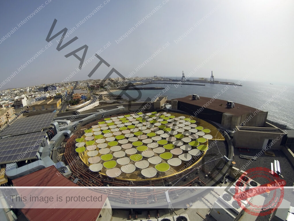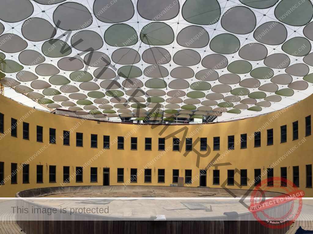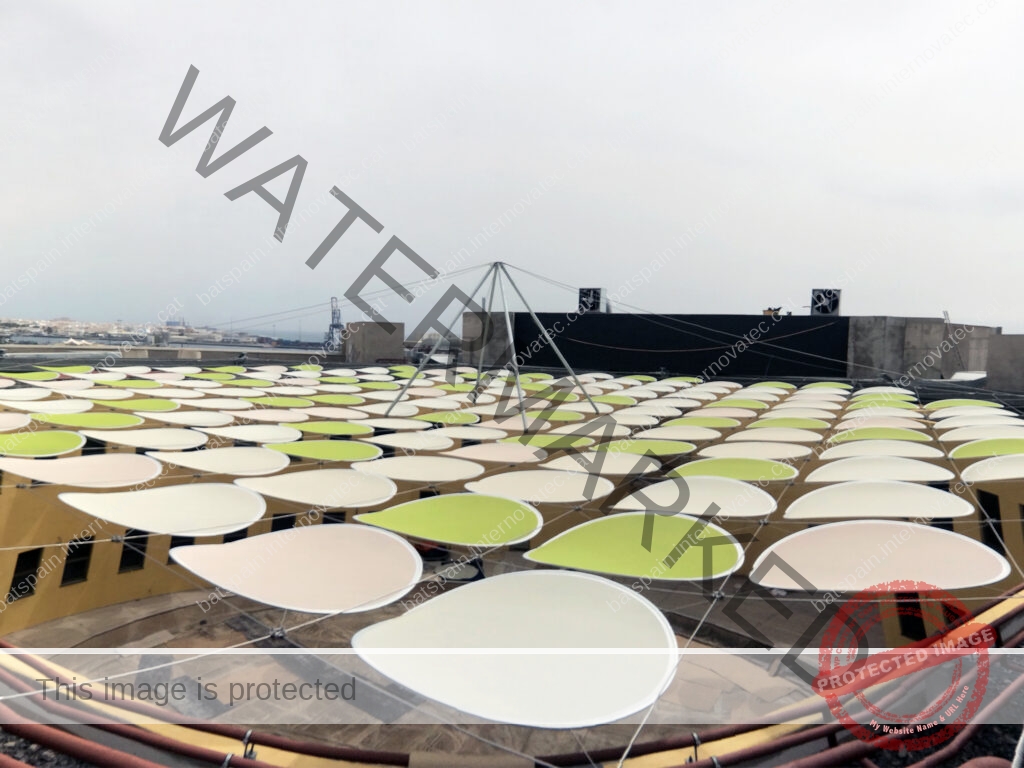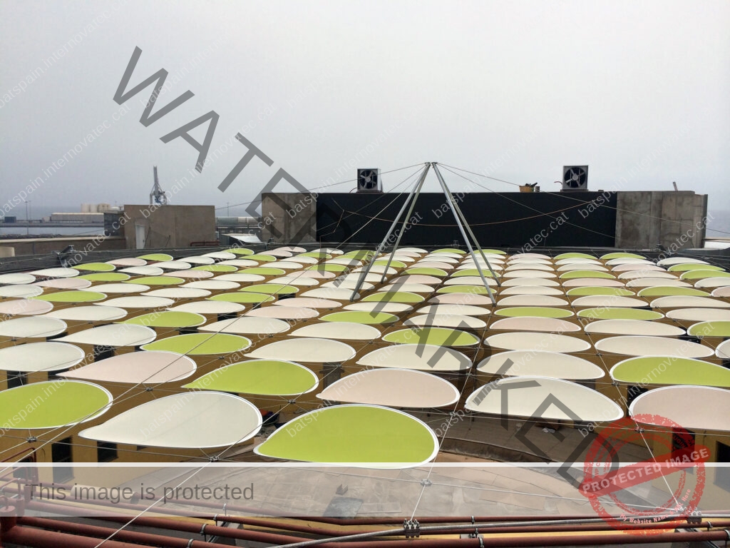 Sobre la malla de cables se disponen módulos circulares de membrana microperforada de diferentes colores.