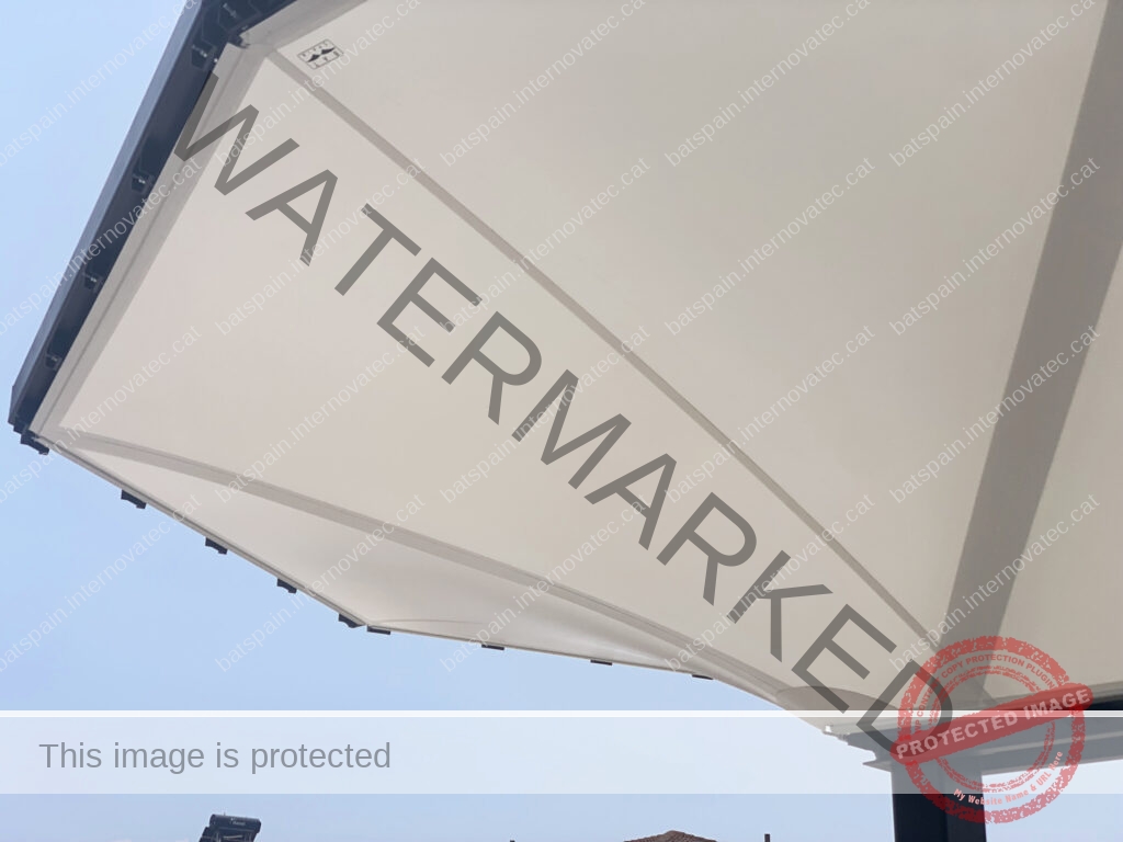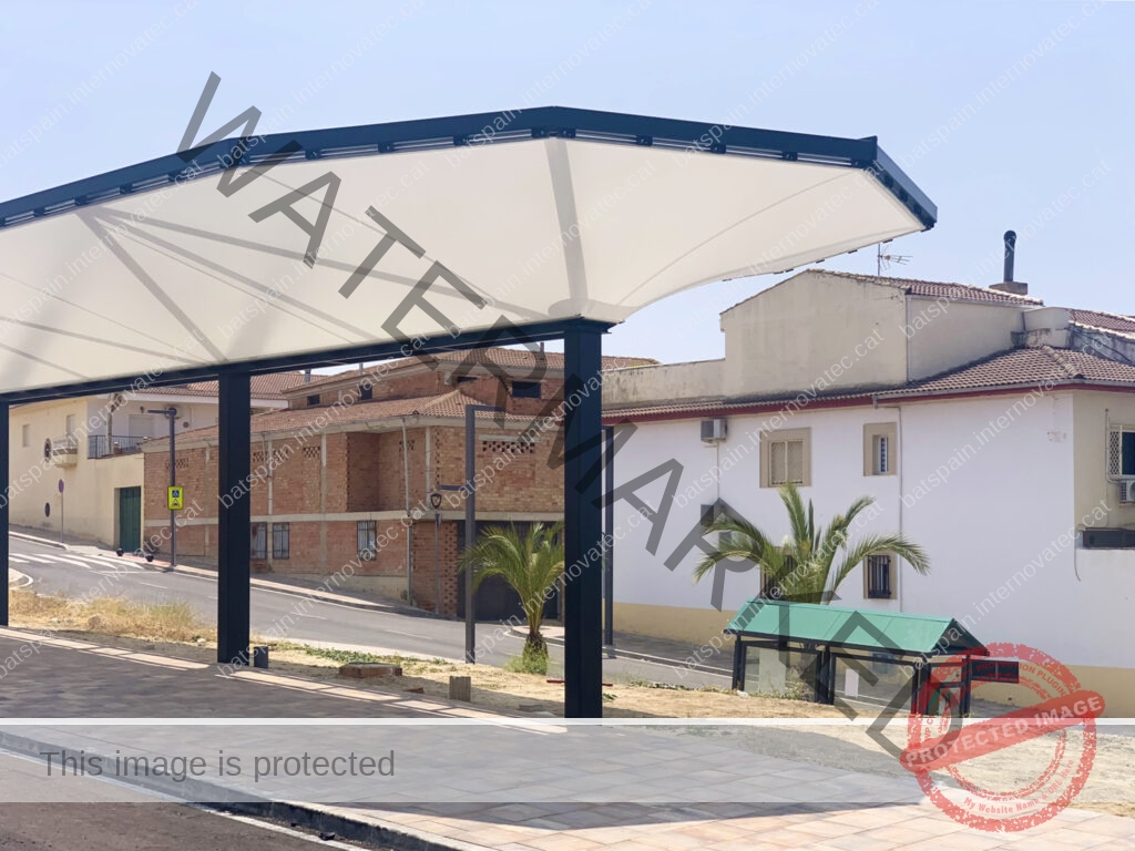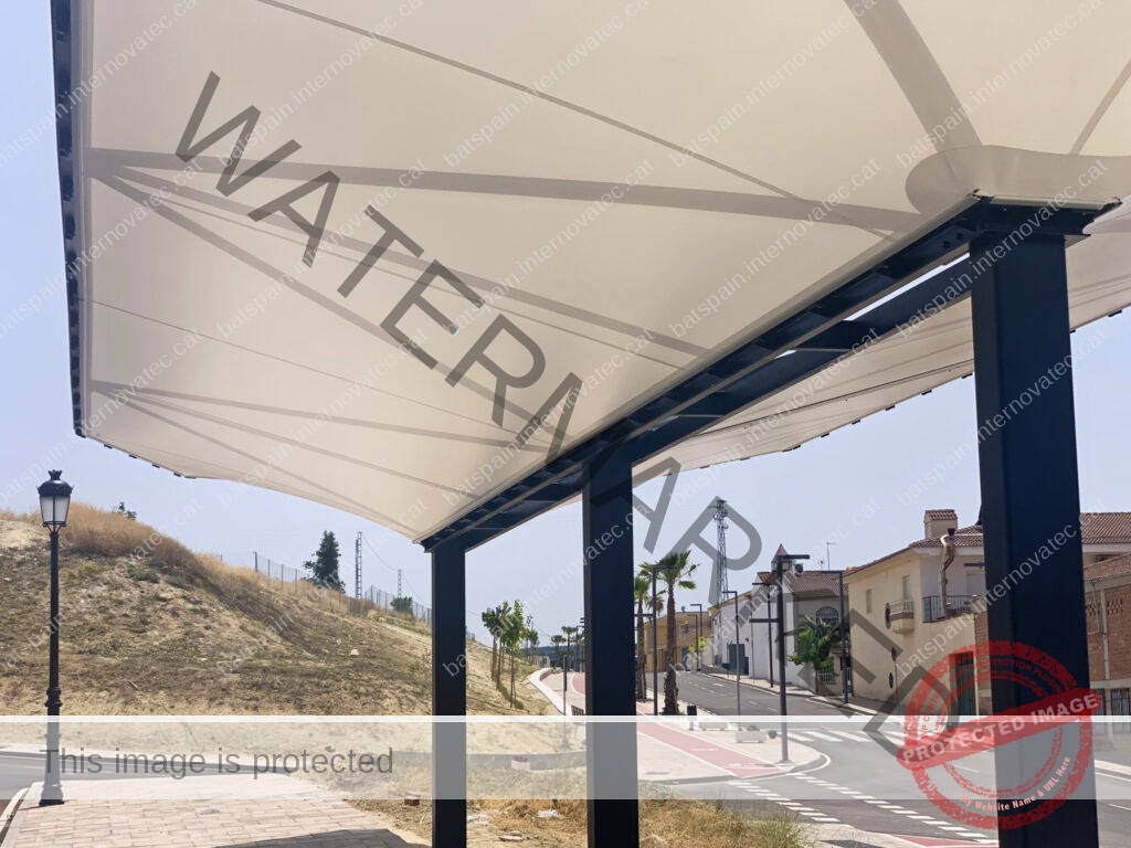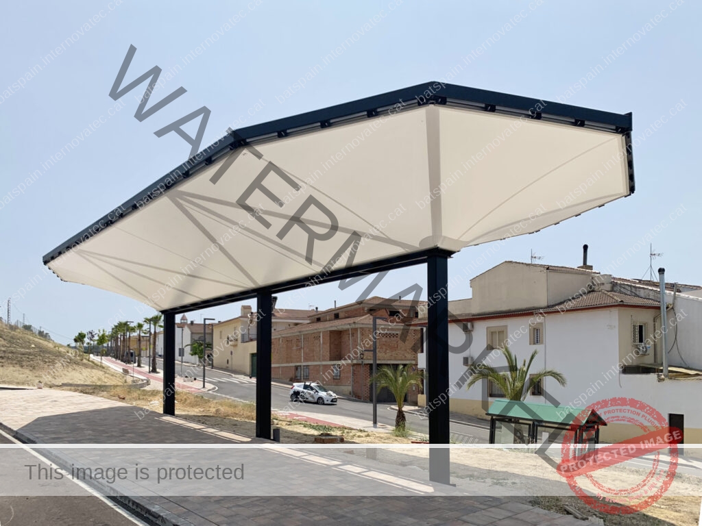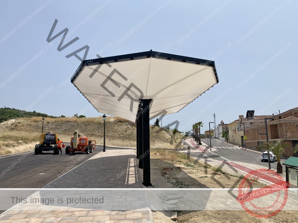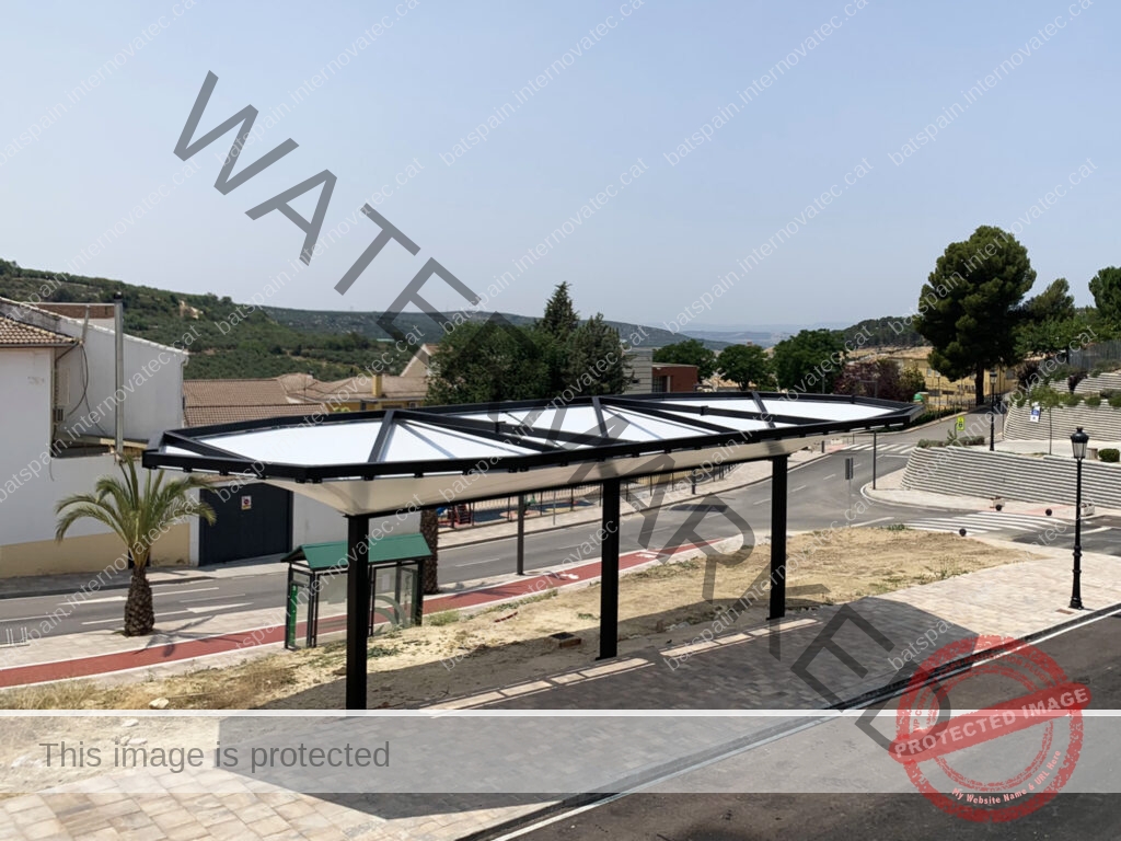 Marquesina de parada de autobuses en el pueblo de Rus, en Jaén. Un solo paño textil de tela impermeable rodea la estructura en voladizo con pilares centrales y es tensada contra la misma con el perfil patentado de aluminio extruido BATbanner.