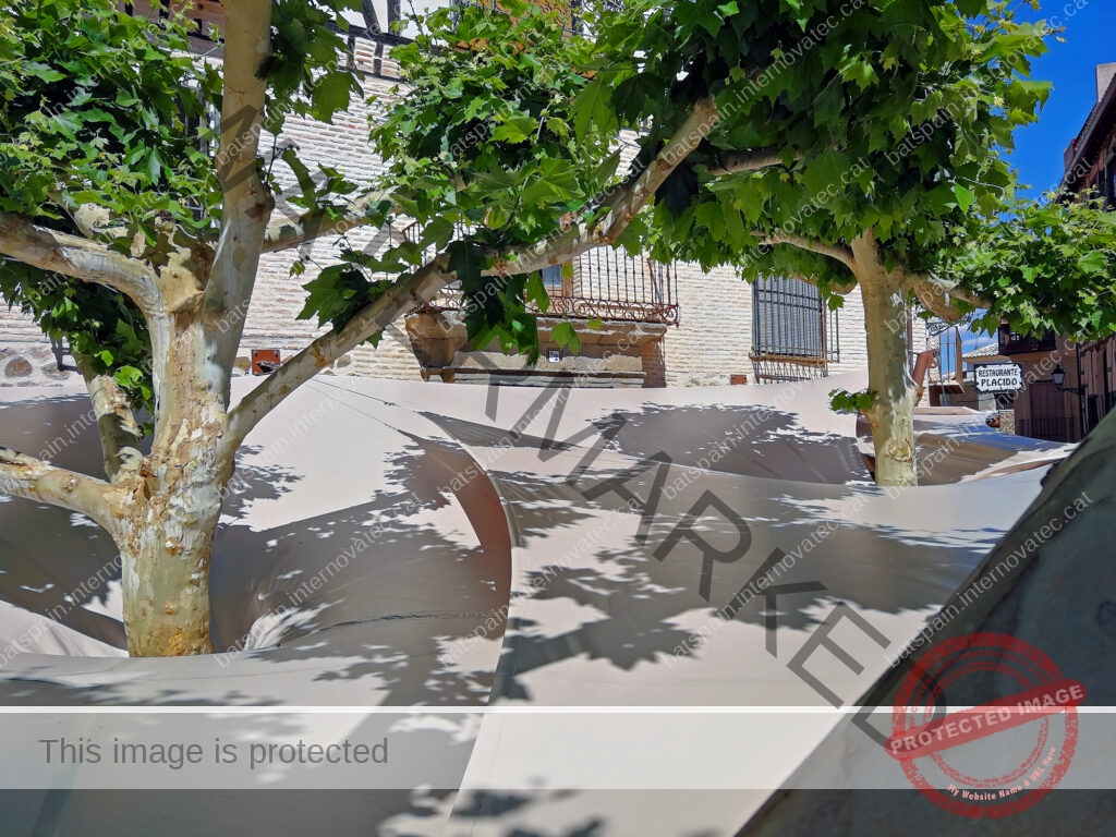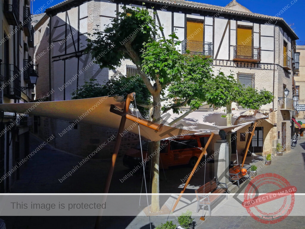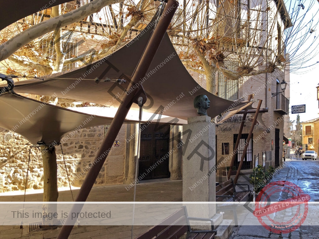 Cubierta textil formada por varias velas tensadas para protección solar y frente a la lluvia de restaurante situado en el centro histórico de Toledo.